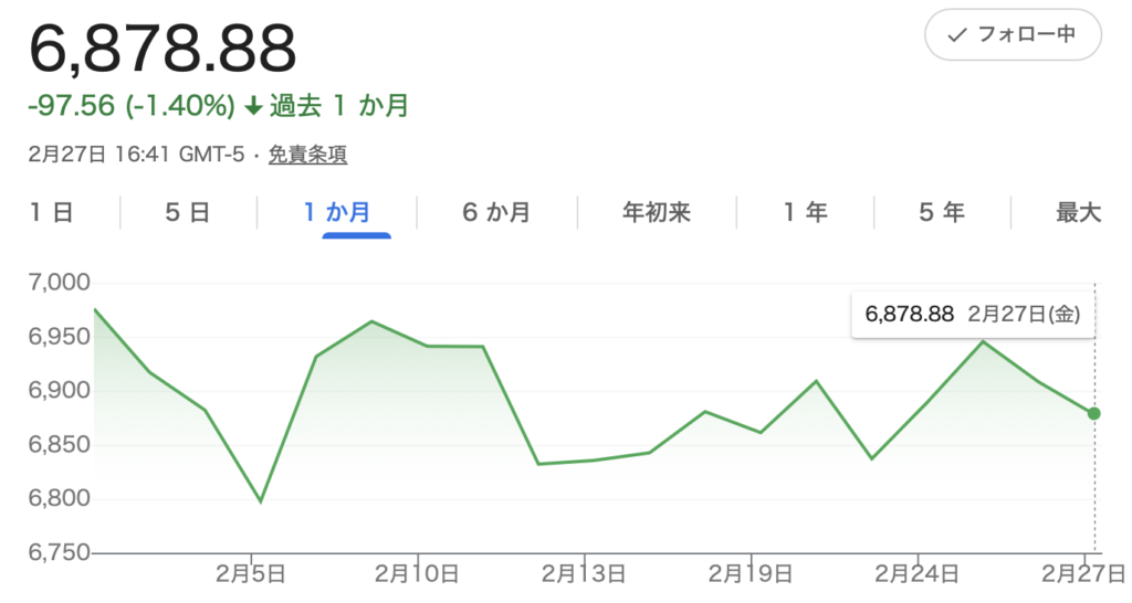2月末(米国市場の月末最終取引日である2月27日)時点で、S&P500は6,878.88(終値)でした。